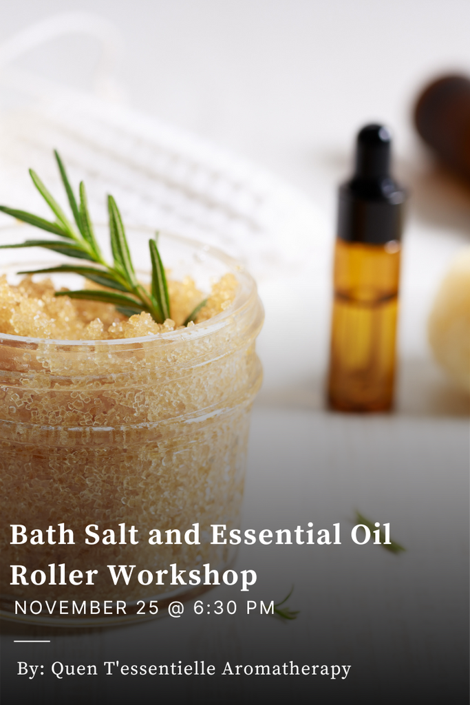 Join Janice from Quen T'essentielle Aromatherapy to create personalized essential oil roller blend with either a bath salt, or simple sugar scrub. Discover the world of essential oils and bring your handmade products home to enjoy! Janice's Fall/Winter collection includes the following scents: Candy Cane Lane, Fallen Leaves, Peppermint Mocha, Vanilla Chai Latte, and Warm Cider.