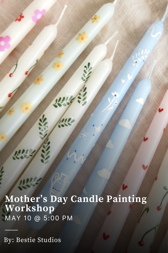 Join Jenna Haripersad from Bestie Studios in this whimsical and adorable candle painting workshop! Jenna will walk attendees through on how to paint candles, provide guidance on design inspiration, and will seal candles in a to-go package to take home! Each attendee receives 2 candles to paint. All supplies included!